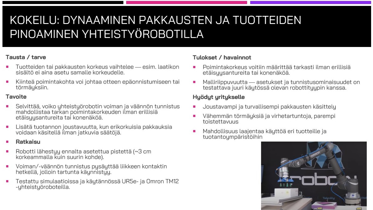 - Yritys + asiantuntijat + RoboAI-akatemian opiskelijat: yhdistää opiskelijoiden käytännön tekemisen, asiantuntijoiden syväosaamisen ja yrityksen oman näkemyksen.